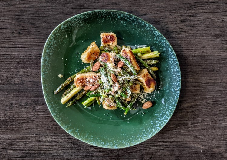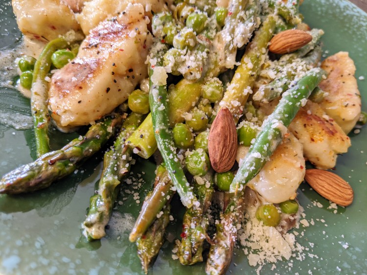 - PoĂȘlĂ© de lĂ©gumes : Huile dâolive, 1 Ă©chalote Ă©mincĂ©e, 1 gousse dâail, 125 g asperges vertes coupĂ©es en morceaux, 75 g petits pois, Parmesan, 10 cl crĂšme fraĂźche, 1/2 jus dâun citron, Thym frais, Quelques amandes ou noisettes graines … selon vos placards