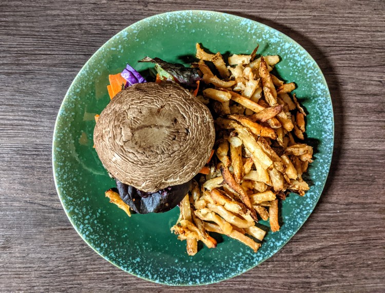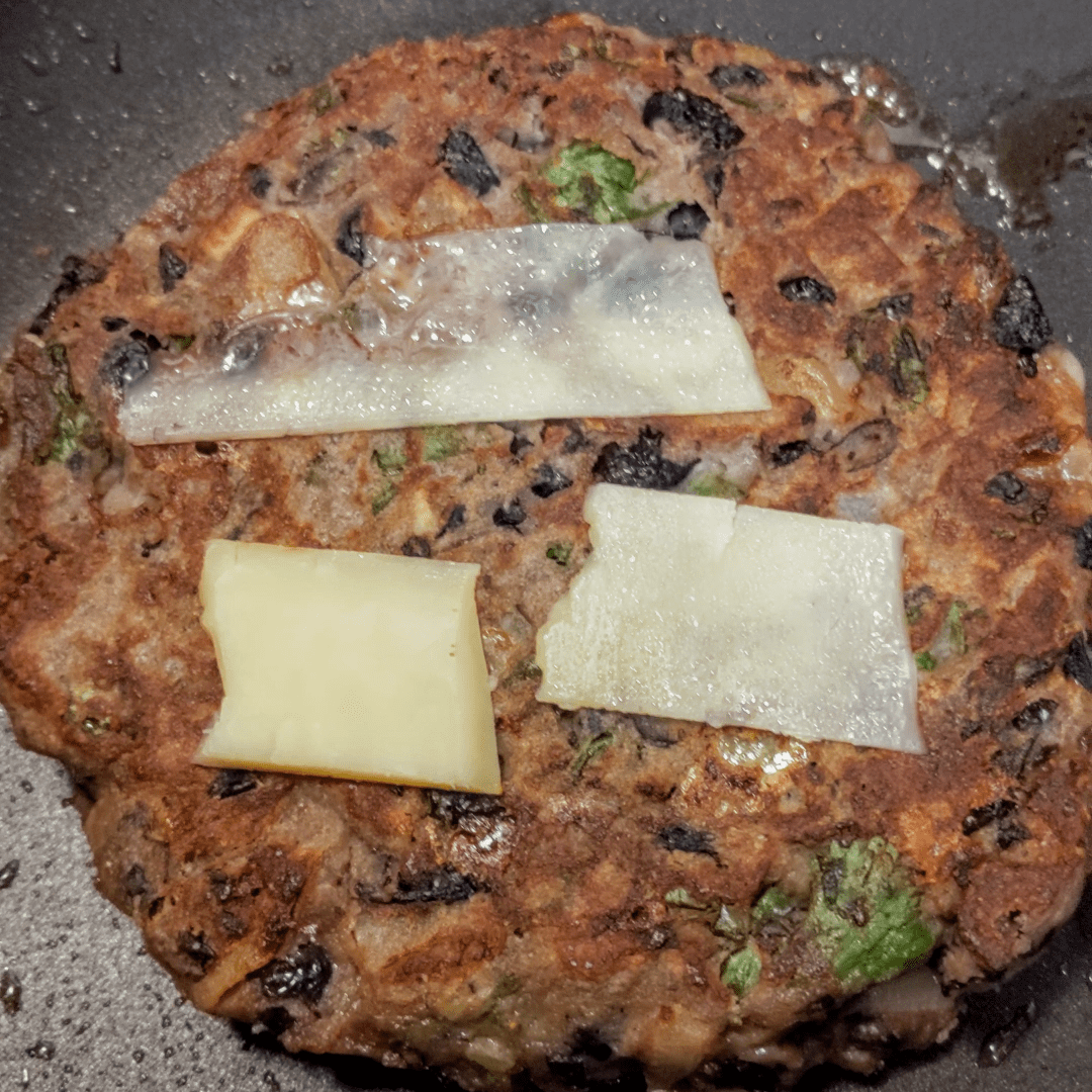 - Montez les burgers : un chapeau de champignon – cheddar – steak de haricots rouges – cheddar – le reste d’oignons caramélises – carottes en lamelles – choux violet et salade – chapeau du champignon