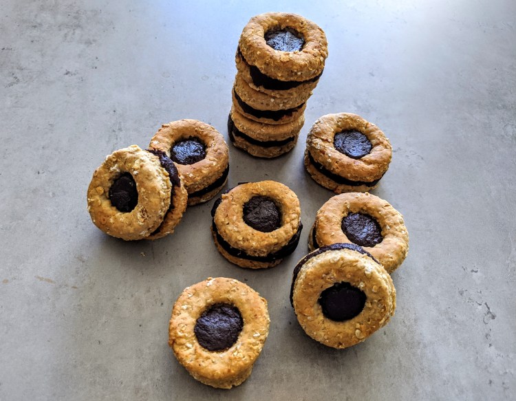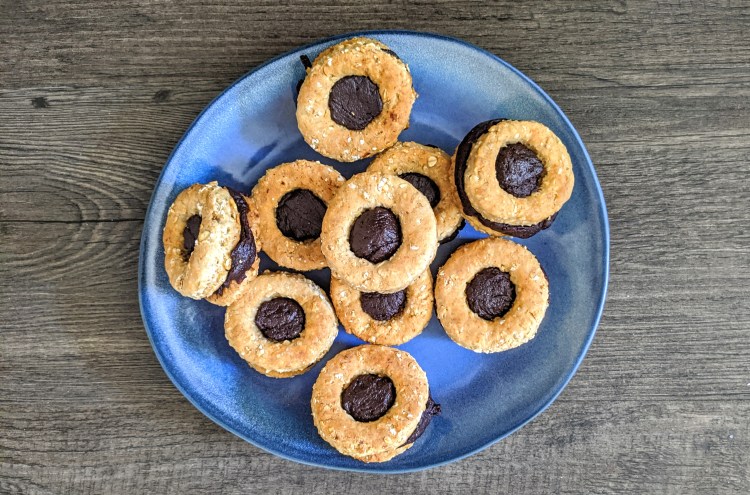 4. Étalez l’équivalent d’une cuillère à café sur un biscuit plein et disposez sur le dessus un biscuit sur lequel vous aurez fait une forme. Puis appuyez doucement de façon uniforme pour ne pas briser le biscuit.